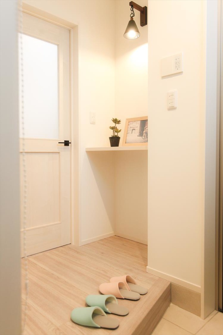 玄関に入ると動線は2つ。正面のドアを開けるとリビング、左側に曲がるとユーティリティーへ進みます。