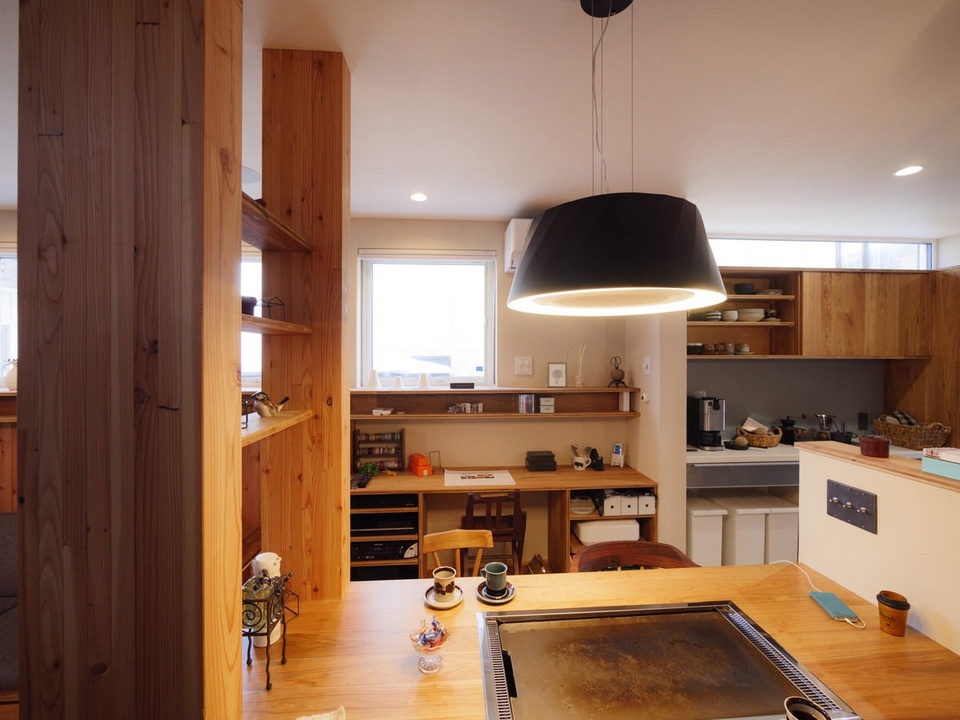 ダイニングのテーブルは鉄板を埋め込んだオリジナル。週に何度もホットプレートを使うので、煙を吸い込んで臭いと脂分をクリーンにできるLED照明「クーキレイ」をつけました。試しに使ったところ、みるみるうちに煙が吸い込まれて焼き肉の臭いもほとんどしなくなるそうです。