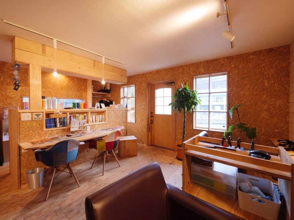 「木の感じがいいね!」とお客さんに好評の店内。壁や床などの下地材として使う構造用合板を「現し(あらわし)」として使い、設計の工夫によってより広く、空間を無駄なく利用する"白田スタイル"は、ローコストで建てられるのも大きな強みです。