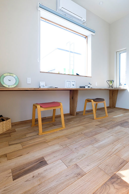 階段の踊り場は、幅が約3.5m、奥行約1.5mもの広さがあります。壁際にカウンターを造作し、フリースペースとして使っています。窓も2ヶ所に設けていて採光も十分。