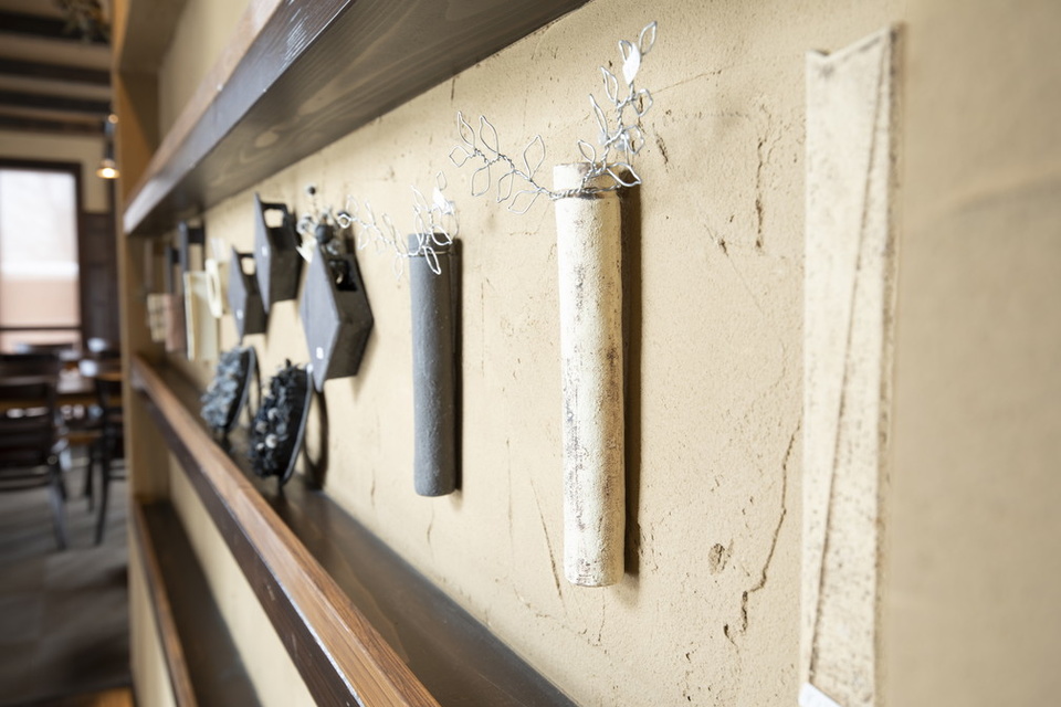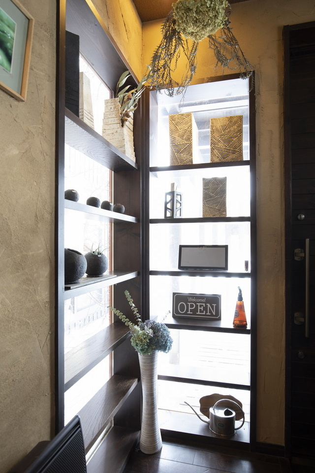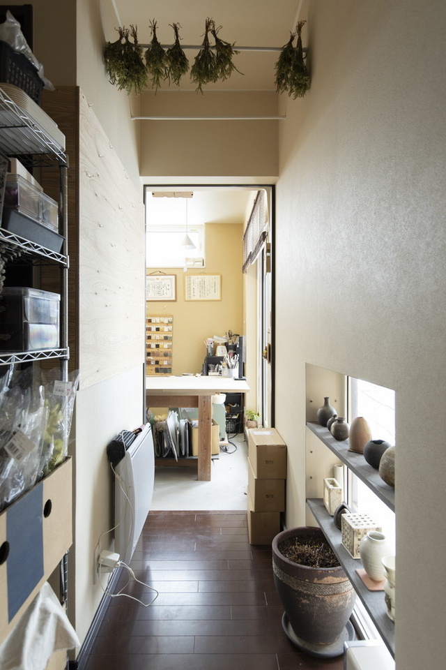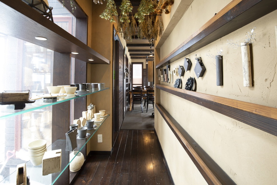 通路の壁面にもディスプレイ用の棚を造作しています。珪藻土の塗壁に陶器の花器がぴったりマッチしています。