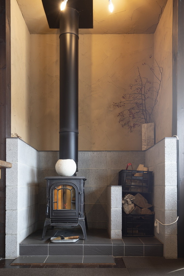 お店の一角にある薪ストーブ。奥さまのご実家も愛用しており、薪ストーブは身近な暖房器具だといいます。