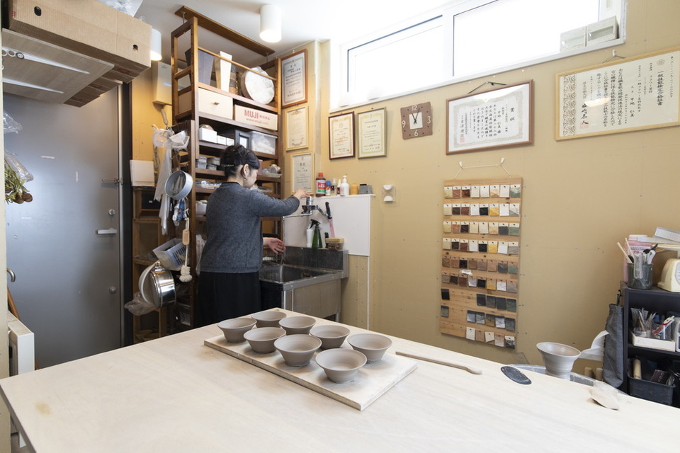 アトリエには便利な作業用シンクも完備。裏に出られる勝手口もついています。形になった器は、裏の物置に旦那さんが取り付けてくれた電気釜で焼いているそうです。