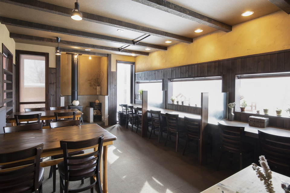ストーブの設置場所はカフェスペースから突出しており、行き来の妨げにならない造り。暖かさはもちろんですが、カフェの雰囲気づくりにも大きな役割を果たしています。