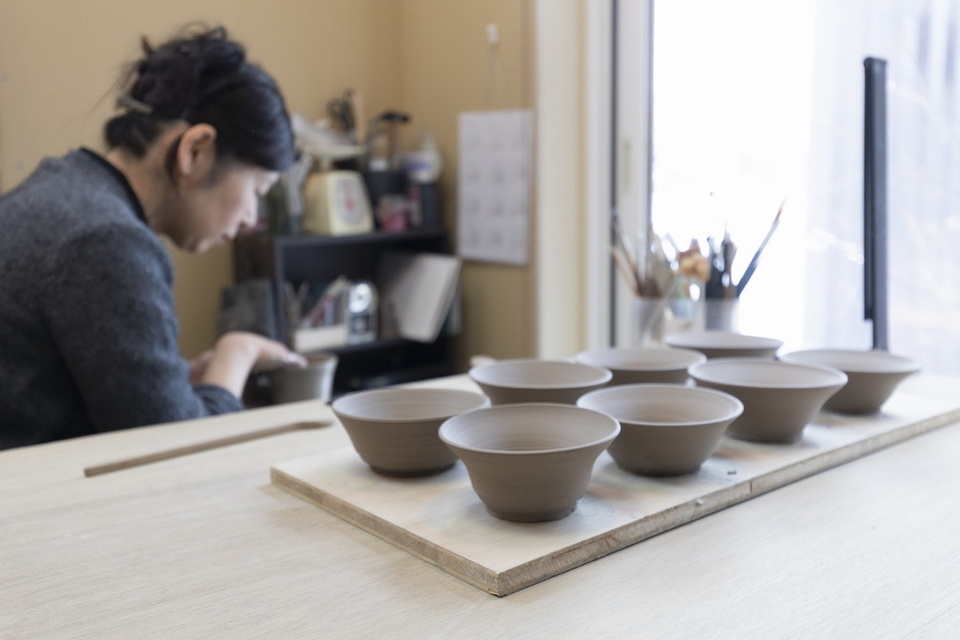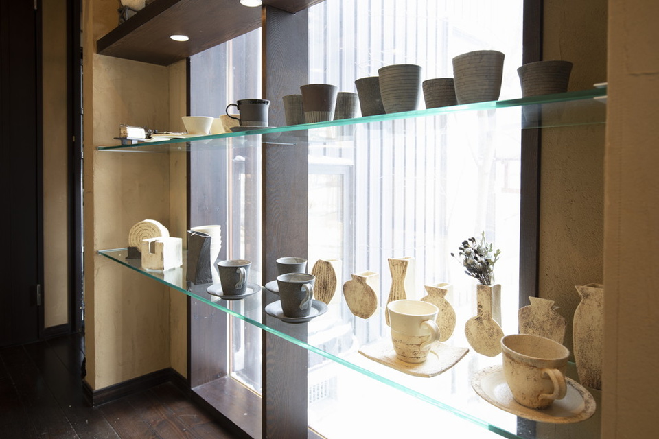 自然光でライトアップされた陶器は、ガラス製の棚板に飾られていて、いろんな角度から1つひとつの作品をじっくりと眺めることができます。