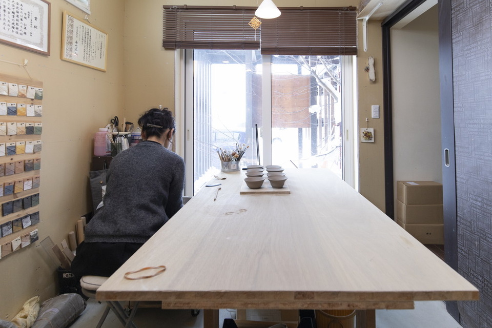 「ここで過ごす時間がとても好きです」と奥さま。大きな開口部からやさしい光を受けながら、創作の時間が流れます。窓の向こうに見えるのは玄関ポーチになっているデッキ部分です。
