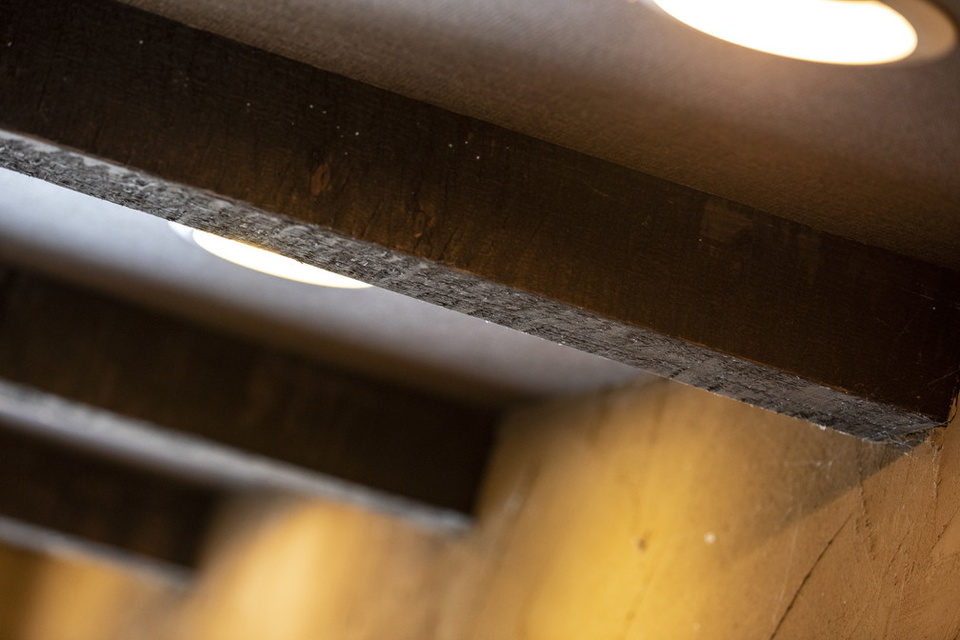 古民家を連想するような化粧梁は、チェーンソーで傷をつけ、古材風に仕上げたこだわりポイント。