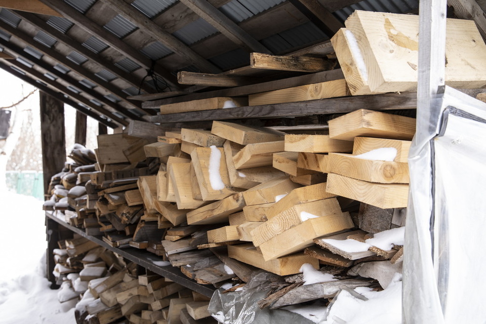 建物の裏ににある、奥さまのご両親が作ってくれた薪小屋。傾斜屋根からフェンス向こうの野原に雪が落ちるようになっている。薪は、ご実家からのおすそ分けや、廃材などを利用しているそう。