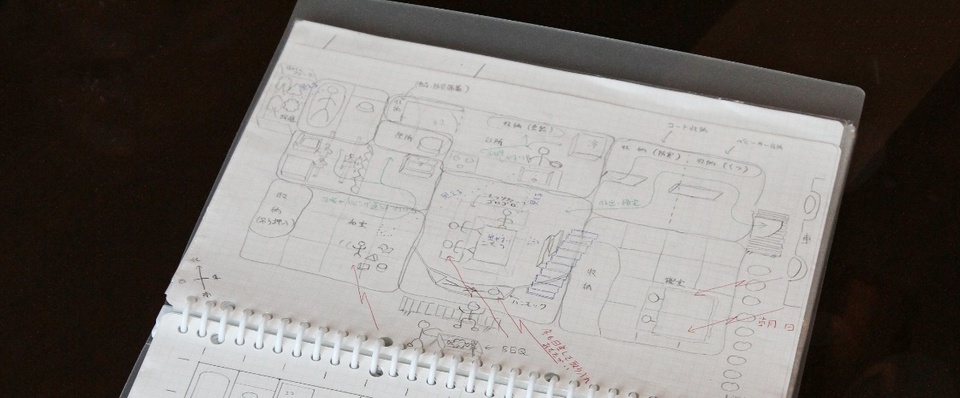 この手書きの図面はご主人が、打ち合わせの初期に山野内建設さんに提出したものです。冬季の日射取得や、防災備蓄ができる収納スペースなどのほか、客間(和室)から来客がリビングを通らずに洗面化粧台やトイレなどに行ける動線が書かれています。