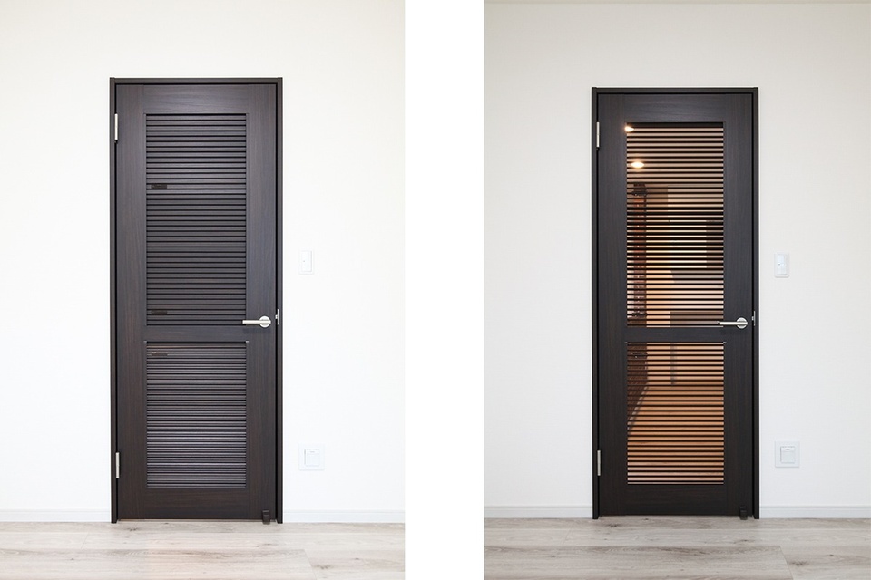 2階子ども部屋のドアは通風タイプ。ドアを閉めたままでも風通しが良くなり、猛暑の日でも6畳用エアコン1台で家じゅうの温度を下げることが可能です。