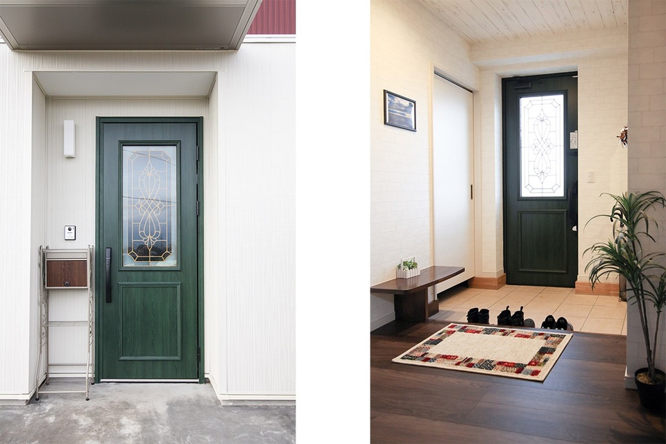 外観の色合いとのバランスで玄関ドアの色はKさんも大いに悩んだそうですが、とても素敵な色合いでした。