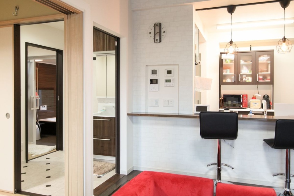 キッチンは対面式ですが、来客からシンクの中などが丸見えにならないように、目隠しの壁を配置しています。