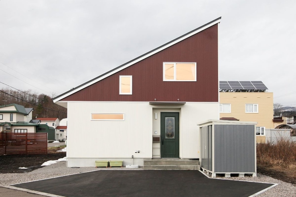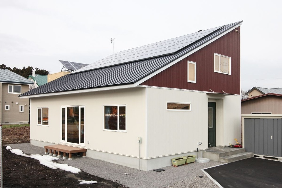 2019年末に完成した北斗市のT邸。「片流れ」屋根のすっきりとした外観、間取りや内装の工夫も見どころですが、ノースランドホーム(山野内建設)が設計施工した家ですから、例外なくK邸も省エネ・創エネ性能が最大の特長です。まずはその点からご紹介します。
