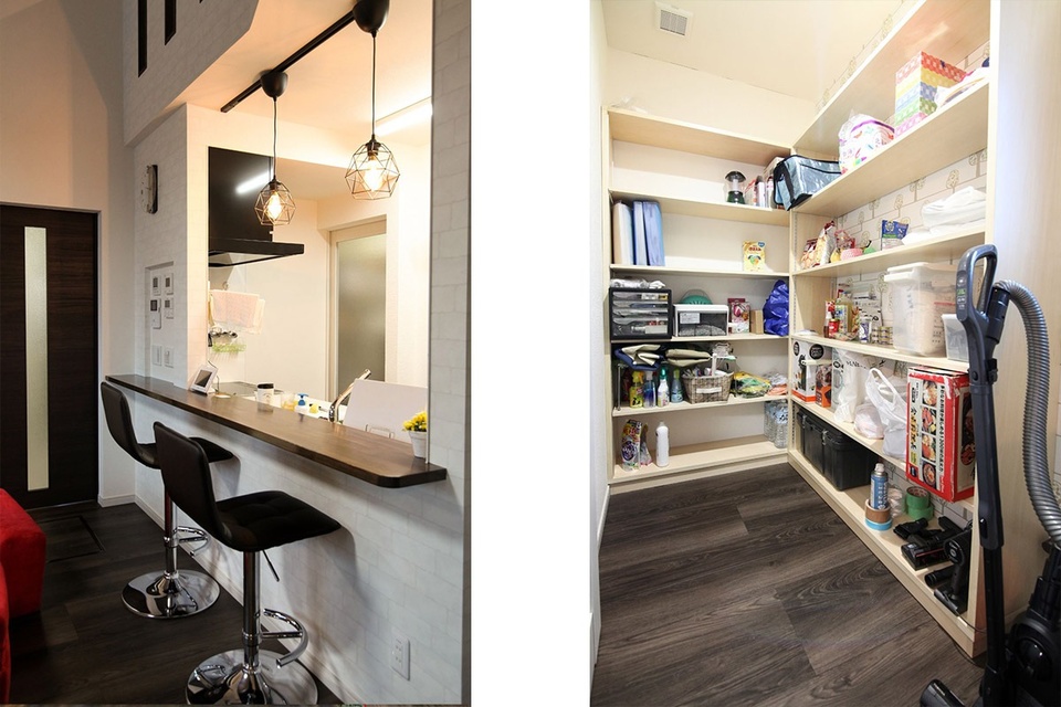 左側の写真はキッチンの手前に併設されたカウンター。ここで朝食を食べれば、洗い物の片づけもサッとできます。そしてキッチンの奥には食品庫(パントリー)があり、その中は右側の写真の通り。食材を十分に保管できる収納空間が広がっています。