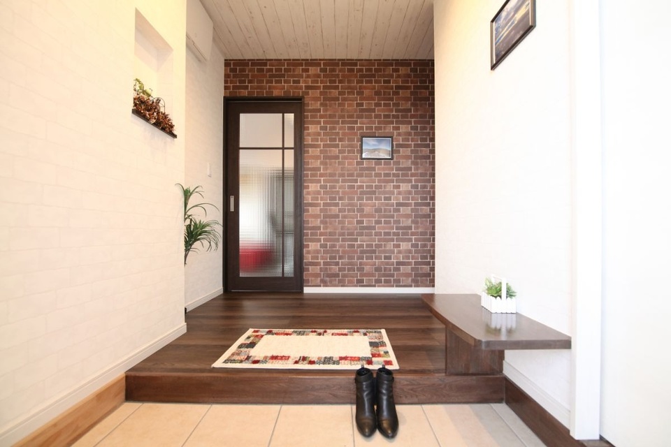 玄関ホール。室内の壁は白が基調ですが、部分的にアクセントになる色、デザインで変化を付けています。