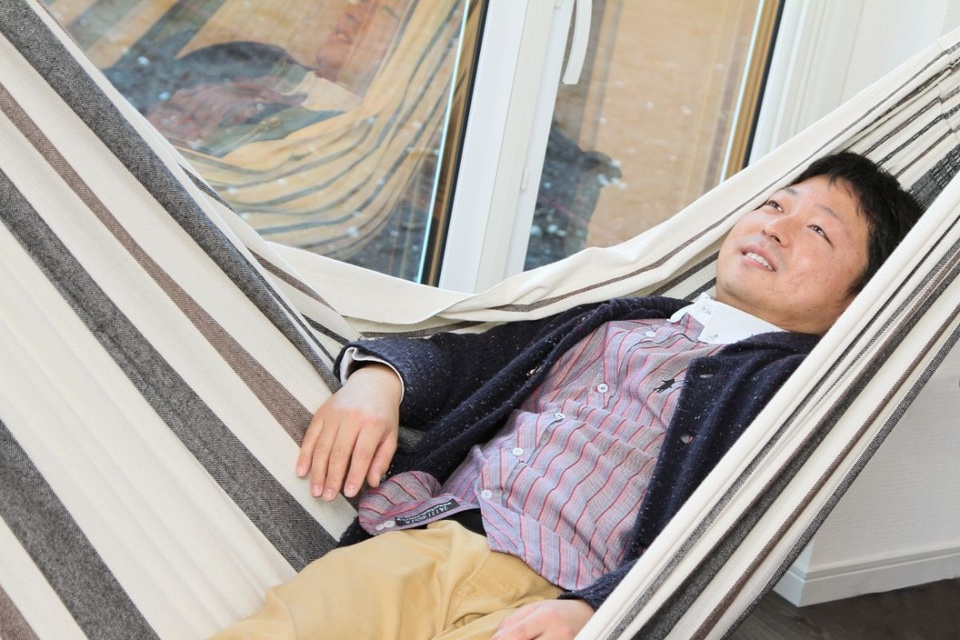 奥さまのアイデアで、リビングに設置したハンモック。窓越しに空を眺めたりテレビを見たり、昼寝をしたりととても快適だそうです。