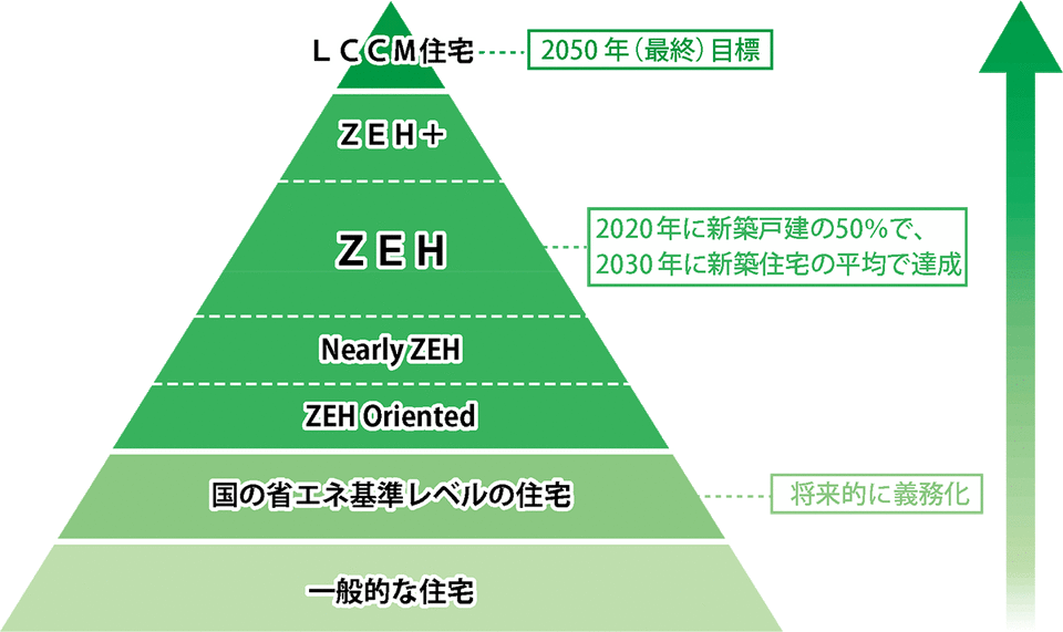 LCCMとは、建設時、運用時、廃棄時において出来るだけ省CO2に取り組み、さらに太陽光発電などを利用した再生可能エネルギーの創出により、住宅建設時のCO2排出量も含めライフサイクルを通じてのCO2の収支をマイナスにする住宅です。