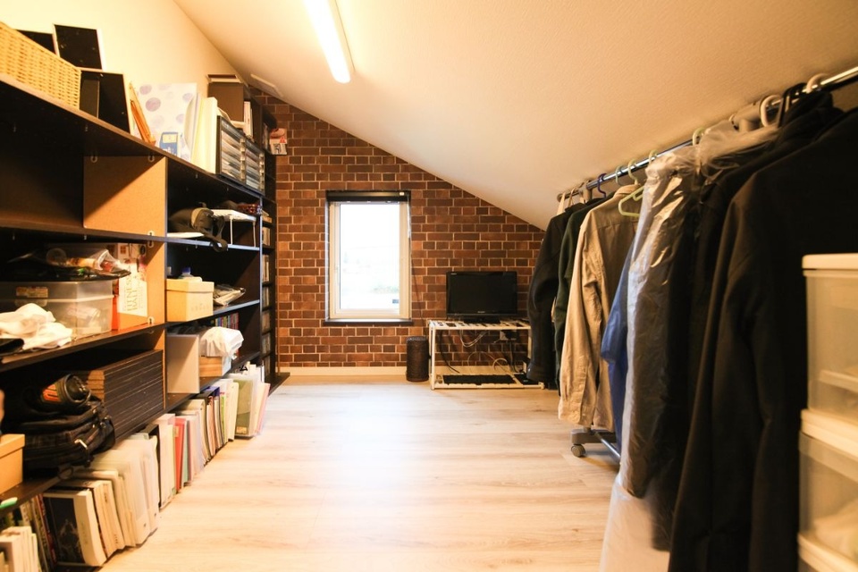 2つある納戸のうち1つを書斎に活用しました。天井は低いものの5.5帖の広さがある屋根裏部屋のようなご主人の書斎。ご主人の持ち物をまとめて収納できたので、主寝室などほかの部屋がすっきり整理整頓できました。