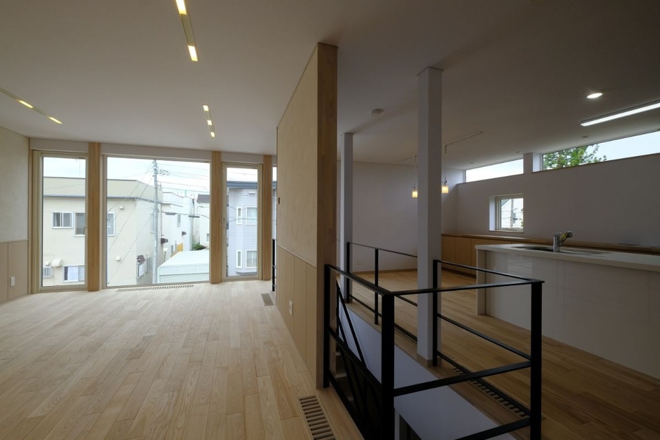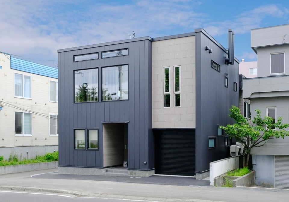 パッシブ換気システム、制震ダンパー、札幌軟石、組み込み車庫、2階にLDK、床に道北・下川産のタモ、天井にヘムロック(米ツガ)の無垢材なども採用しています。