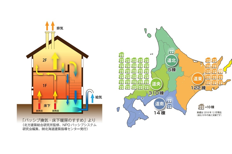 パッシブ換気システムの住宅は、建物内外の温度差、つまり室内の暖かく軽い空気の浮力を換気の主たる動力源とする「計画自然換気」です。機械を使わずに換気を行う、換気と暖房を同時に行うという北海道の産学官連携で開発されたシステムです。道内各地でも多くの実績があります。パッシブシステム研究会公式サイトより