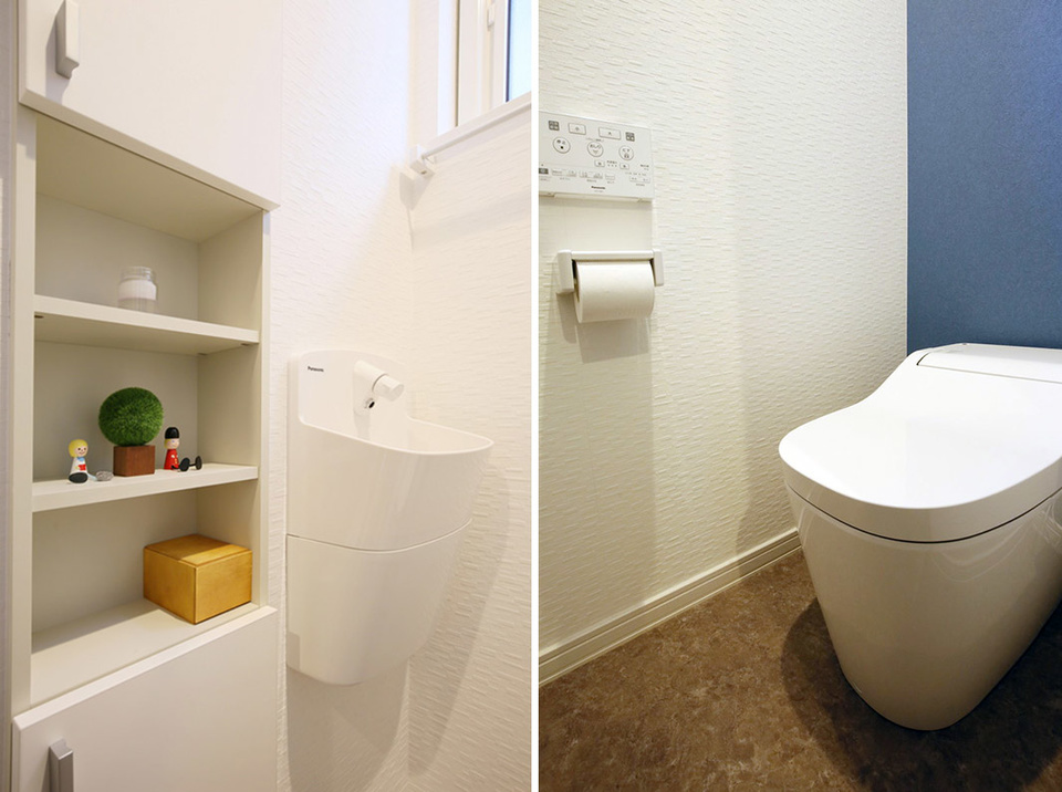 収納や手洗いを備えたトイレ。ブルー系のアクセントクロスも素敵です。