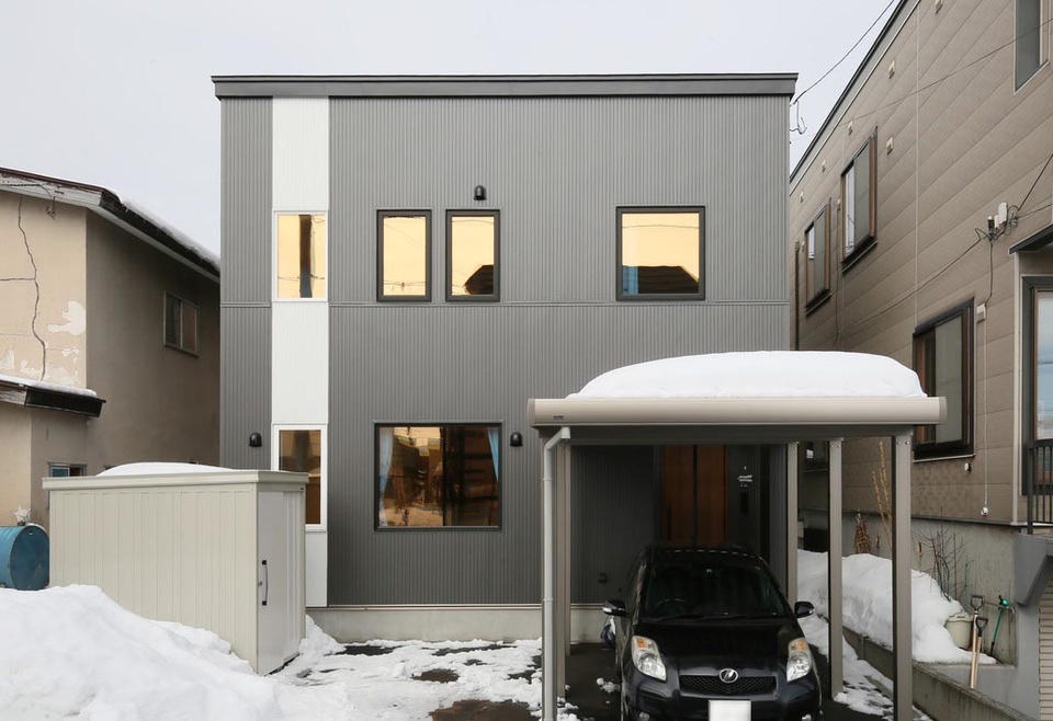 札幌市の閑静な住宅街に、Kさんのお宅があります。総2階、ガルバリウムのスタイリッシュな外観に、カーポートや物置も設置しました。