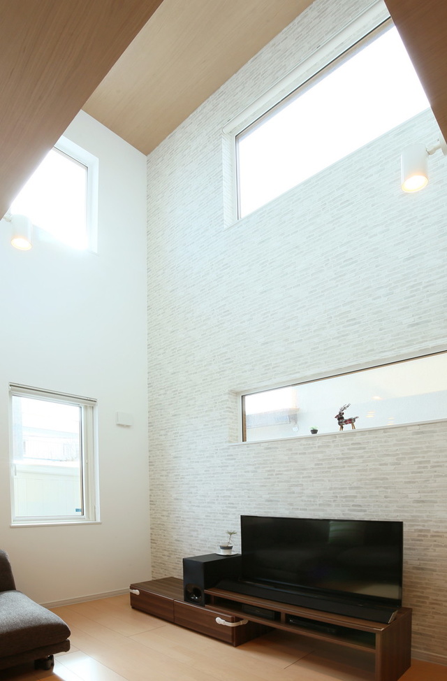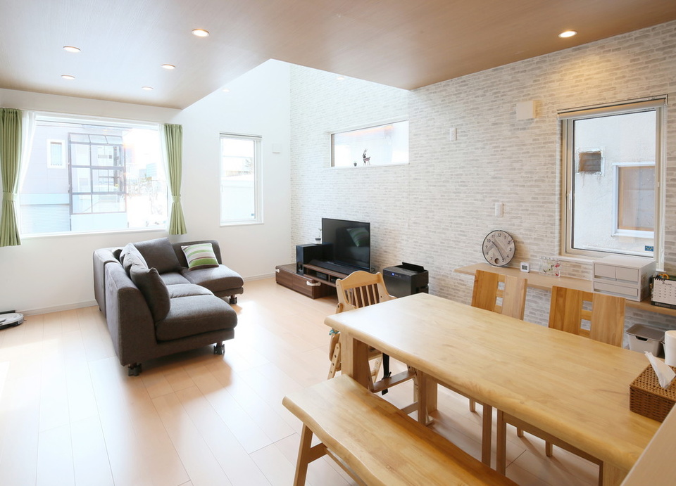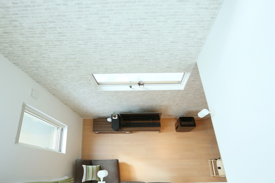 吹き抜けを設けた1階LDK。吹き抜け窓から日差しを採り込む明るい空間に仕上がりました。ホワイト・レンガのアクセントクロスや、天井に使った木目調のクロスでインテリア性にもこだわりました。照明はダウンライトのみで、スッキリ広々とした印象です。