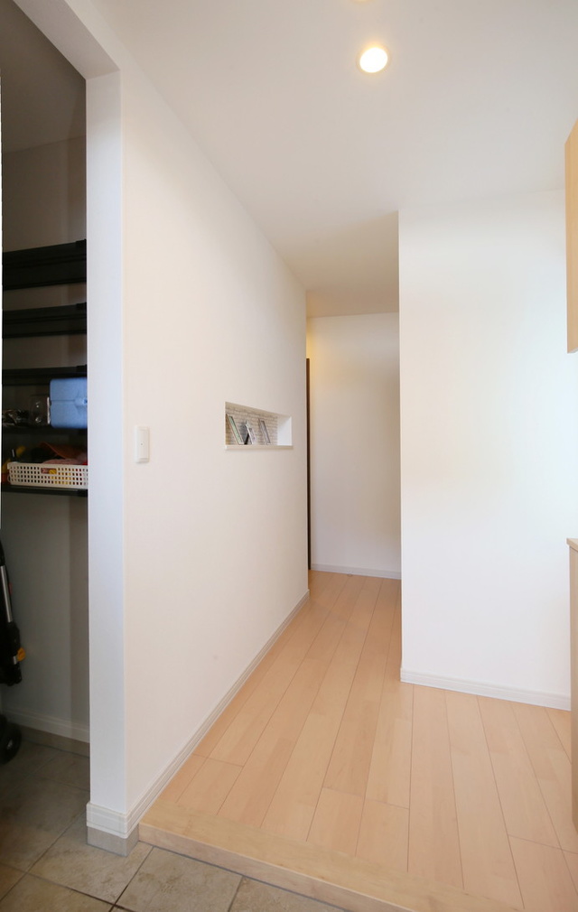 玄関にはベビーカーなども収まるシューズクロゼットを設けています。向かって突き当りの右側にトイレがあり、左手がリビングに続く廊下です。突き当りのすぐ左手には、ユーティリティーのドアがあります。