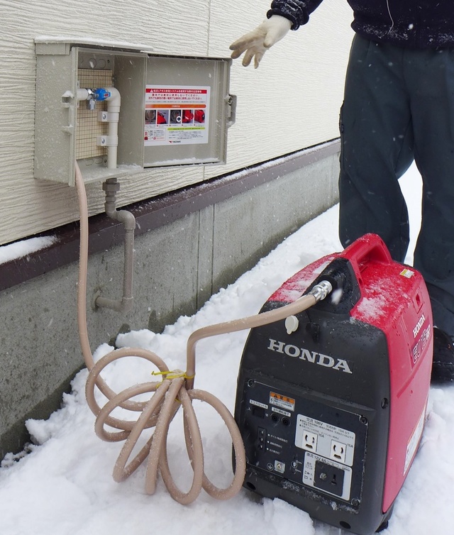 株式会社赤坂建設(十勝・池田町、赤坂正社長)は、停電時に商用電源からLP ガス発電機による自家発電に簡単に切り替えられる開閉器を、10 月に完成した戸建住宅の外壁に取付けた。「災害に備える家」として現場公開したところ、40 組以上の見学者が訪れた。(中略)