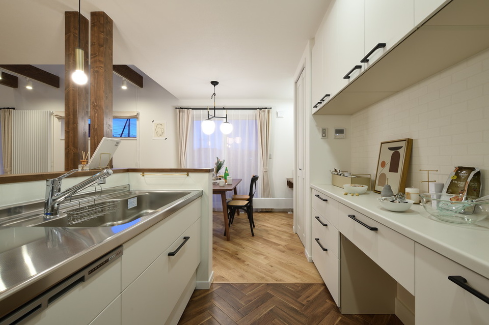 「slow+」のキッチンはオープンな対面式で、横並びにダイニングのある配置になっていて、配膳や片づけもしやすい造りです。大人数で料理をつくったり、親子でクッキングや、パパの家事参加もしやすいプランになっています。