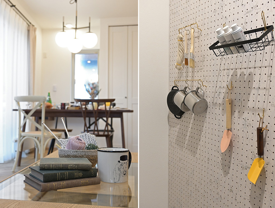 玄関には土間続きにシューズクローゼットをプラン。ベビーカーや三輪車なら十分に収まるスペースになっています。インテリア性の高い有孔ボードの壁面は、趣味の道具や、上着、子どもの遊び道具、傘など、掛ける収納としても重宝しそうです。