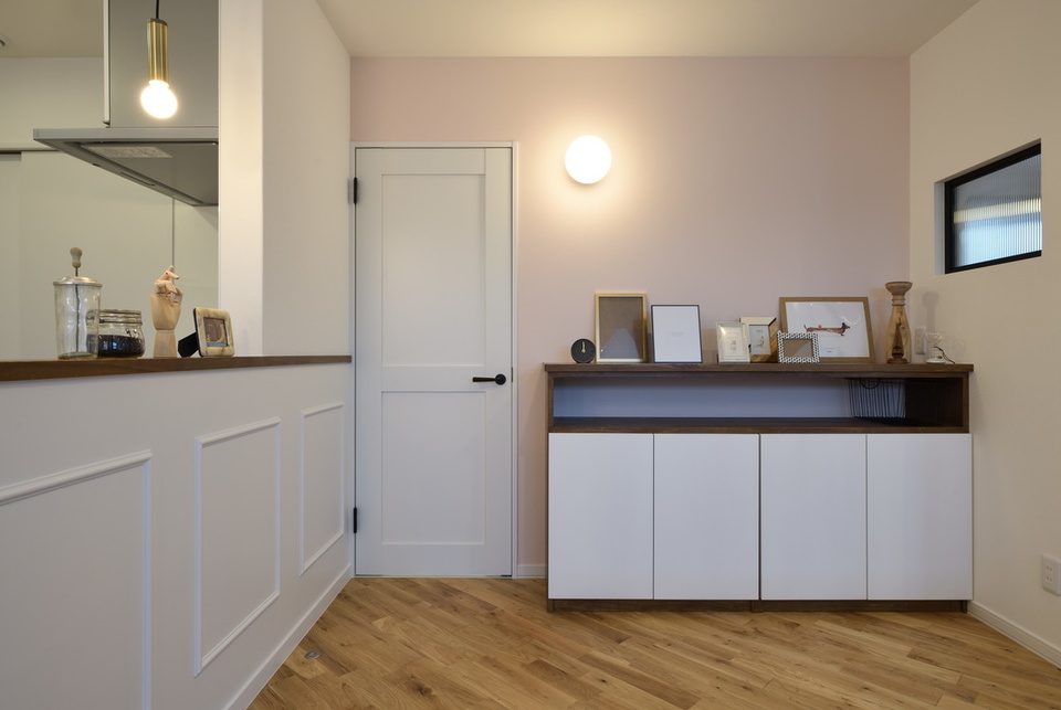 淡いピンクの壁を背にした家具風収納は造作によるもので、収納力もあるためスッキリと過ごせそう。「好みの雑貨やお子さんが描いた絵を飾るなど、ディスプレイを楽しんでいただける場所としてもご提案しています」と阿部さん。
