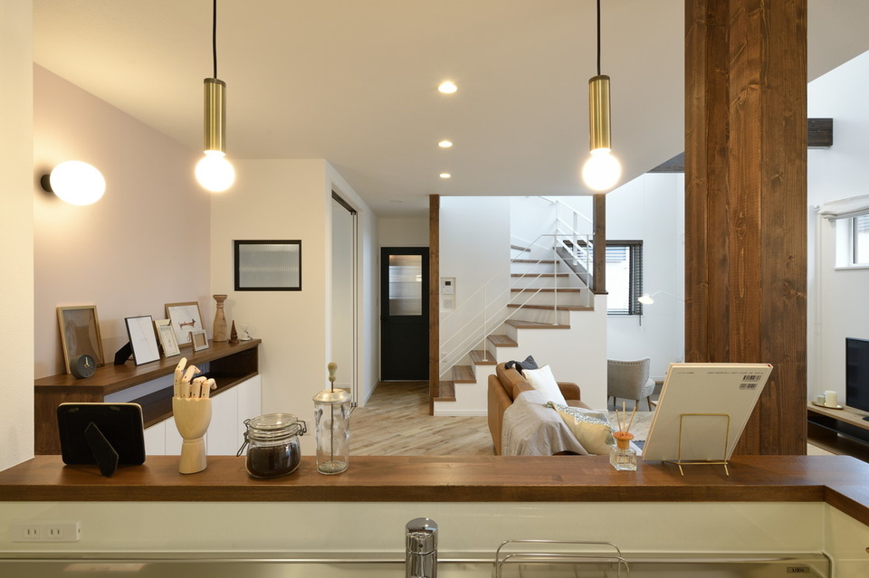 LDK全体が見渡せるキッチンや、家族の行き来を見守れるリビング階段は、イネスホームが子育て世代に向けてプランニングする際の基本要素です。