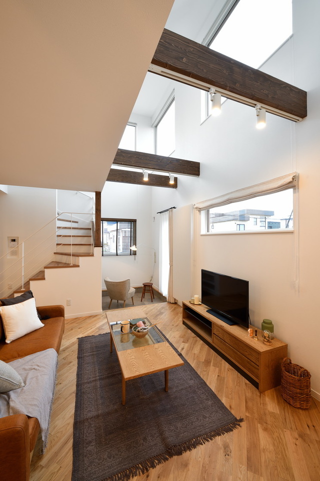 リビングの床はナラの無垢材を斜め45度に貼り、クリア塗装で仕上げたこだわりポイント。自然素材を使った飾らない雰囲気はそのままに、空間にリズミカルな印象を与えています。