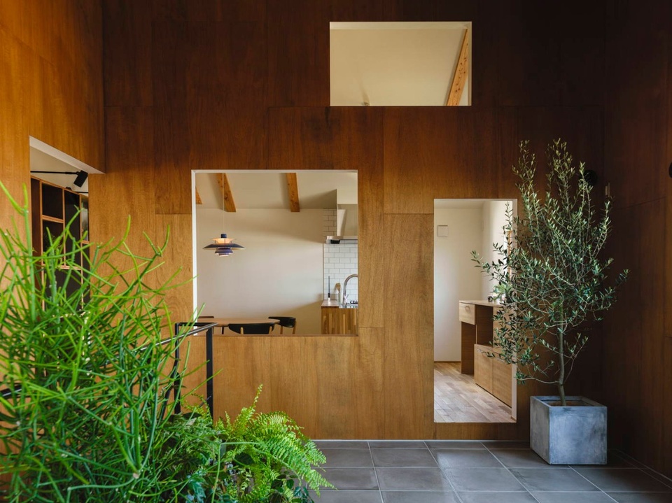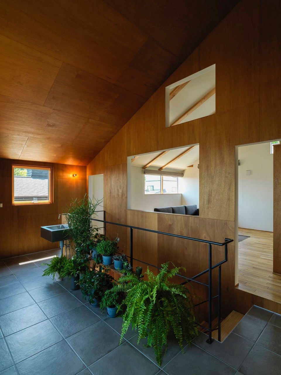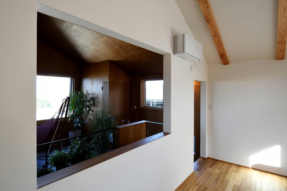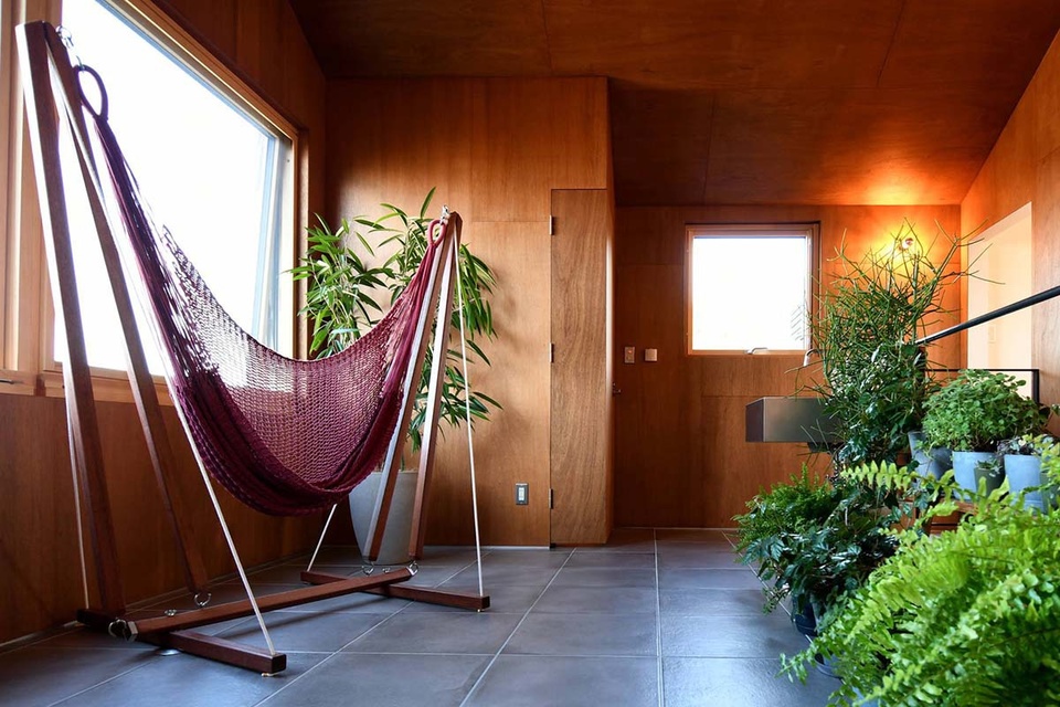 リビングが珪藻土の白い塗り壁なのに対し、サンルームはラワン合板のカジュアルな内装。中と外、光と影のコントラストが印象的です。
