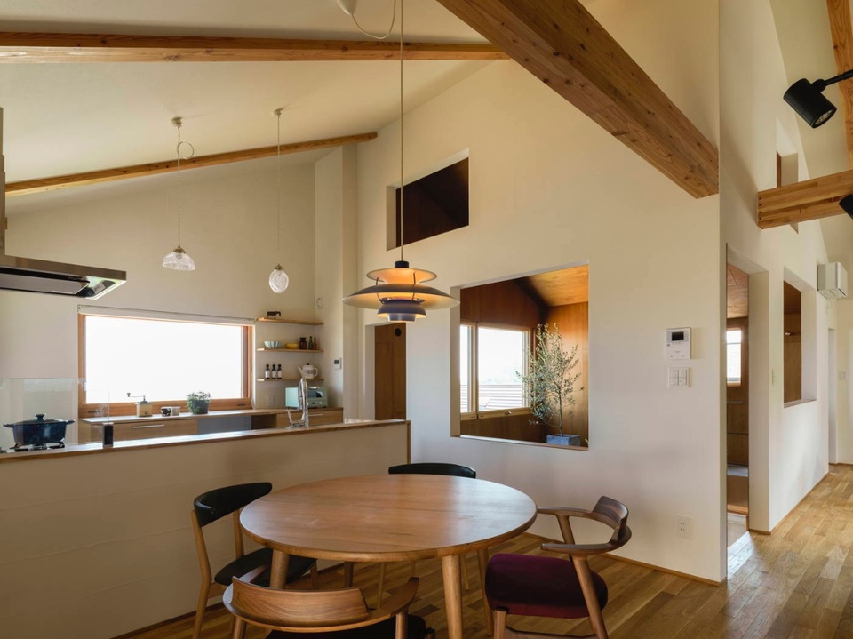 三角屋根を生かした屋根なり天井だから、キッチンダイニングも開放感いっぱい。道産カラマツ材の梁がアクセントになっています。