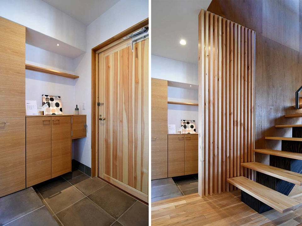 カーポートの奥にある玄関ドアを開くと、出迎えてくれたのは、すがすがしい木の香り。深呼吸したくなる気持ちよさです。