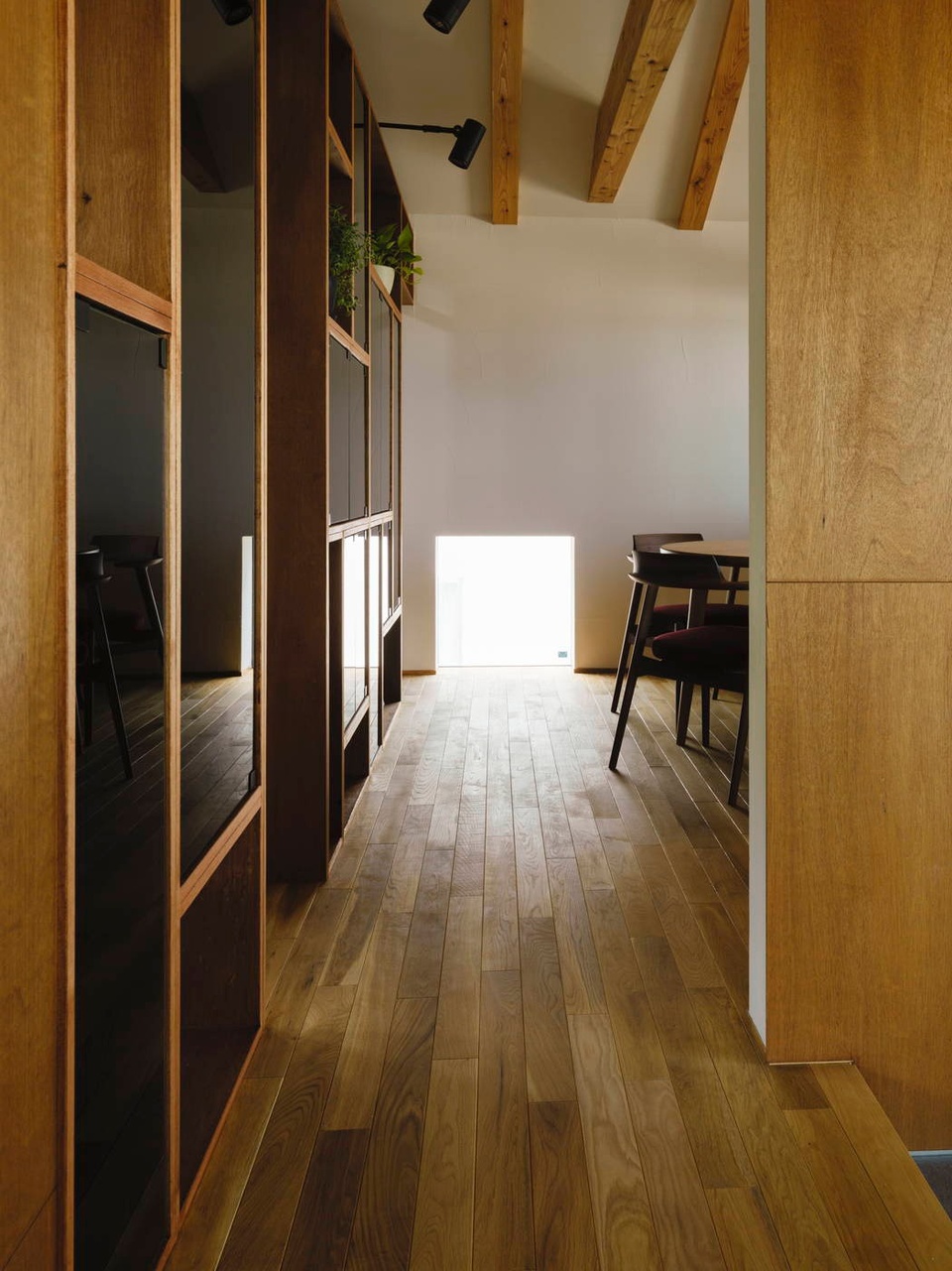ダイニングに向かう動線の視線の先にも、光の漏れる地窓。