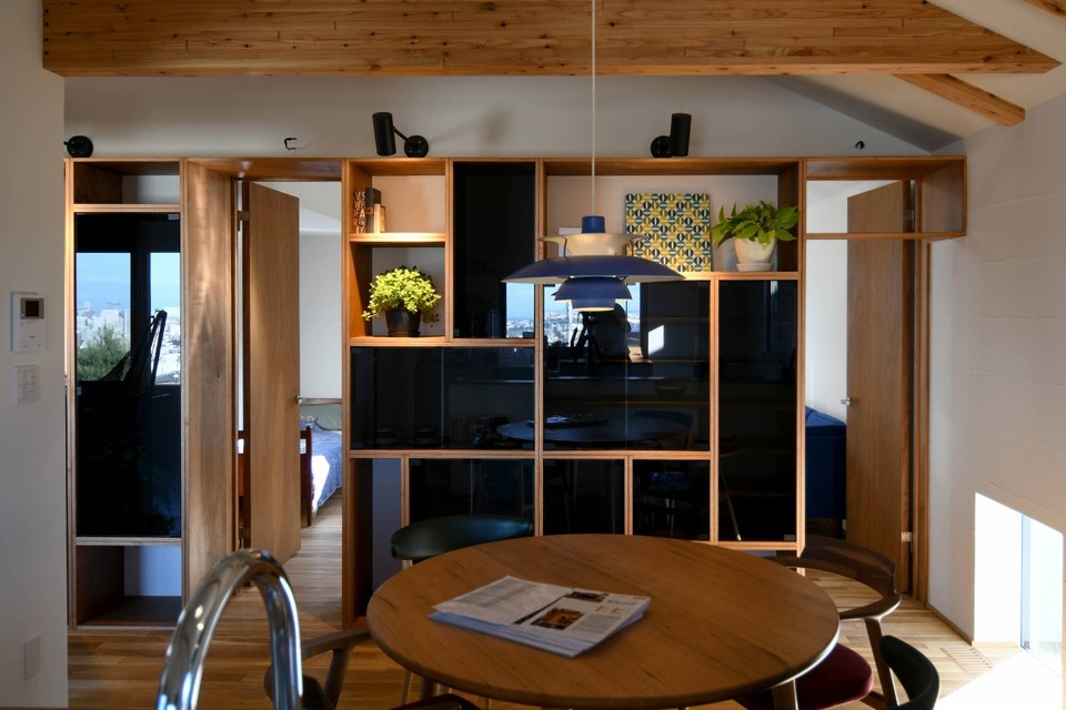 ダイニングにしつらえた幾何学的なキャビネットは造作もの。