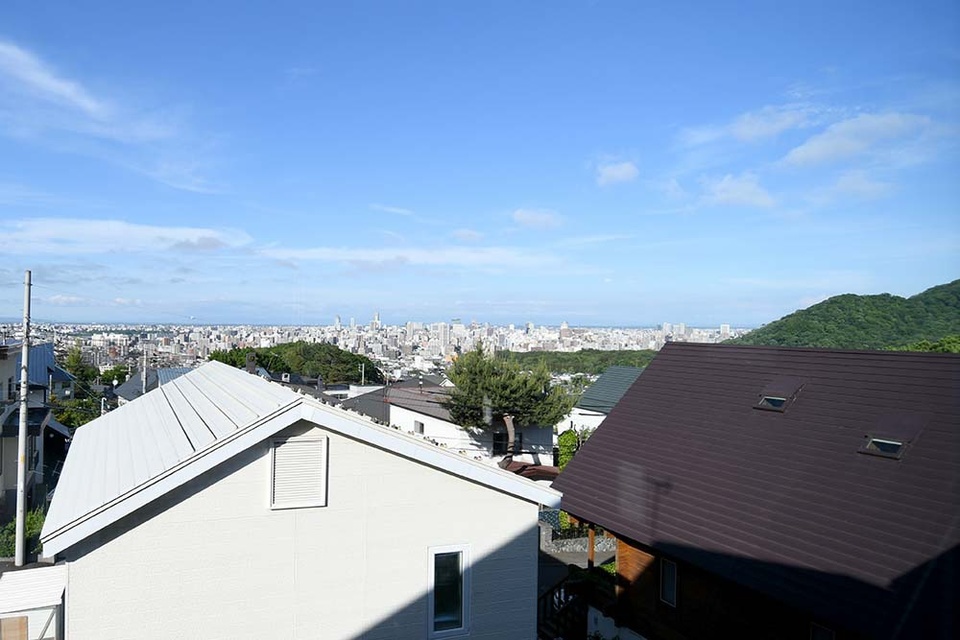 木製サッシの大きな2連窓から、札幌の街並みが一望できる見事な眺望です。