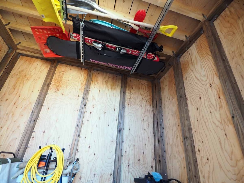 物置にはベビーカーや工具などを保管。天井部分には、アタッチメントを取り付けて冬しか使わない除雪用具を収納していました。これから棚板も付けていく予定だそうです。