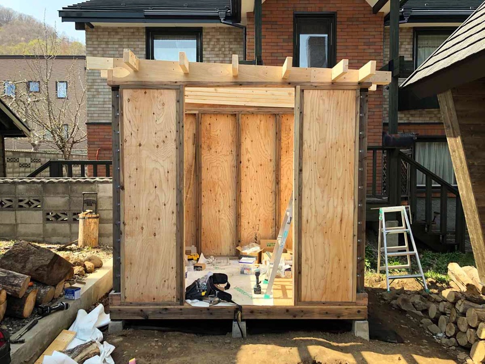 GW後の週末、ようやく完成!あらためて、自分でつくり上げた物置の立派さに見惚れるます。この後に薪棚やウッドデッキも自作、インスタの投稿は「モノづくりってサイコー!」と喜びの言葉で締めくくられていました。