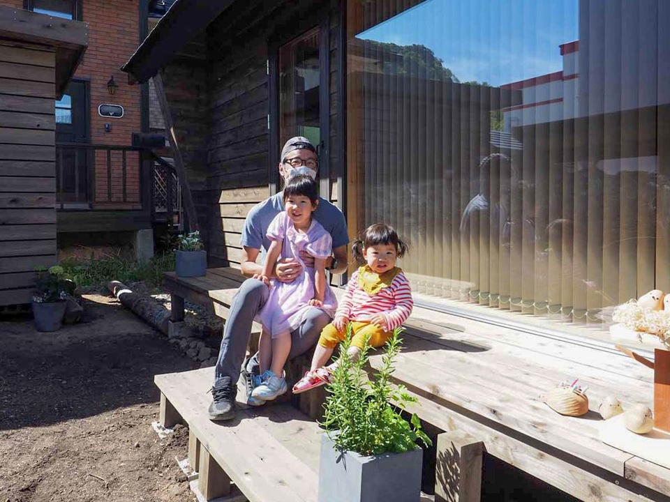 作業の合間に遊びに来たお子さん。「物置づくりになるべく専念できるように、子どもたちの世話をしてくれた妻には感謝しきりです」と話すIさん。