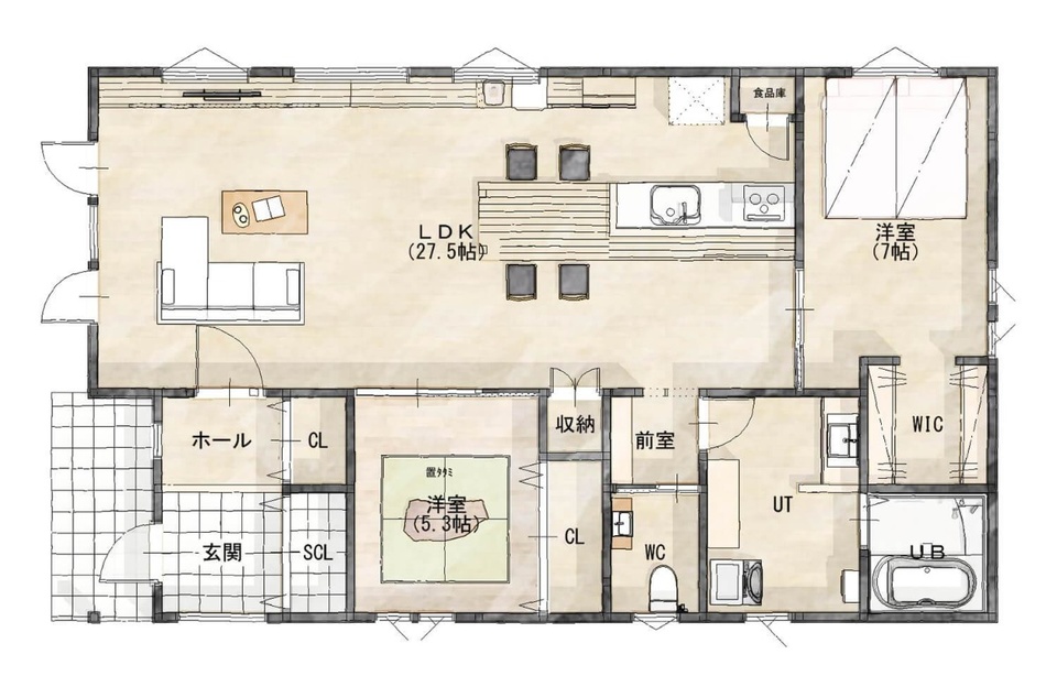 LDKは27.5畳と大きめで、子世帯が遊びに来ることを想定しています。ソファや造作家具、窓の格子も横のラインが基調で和の雰囲気です。
