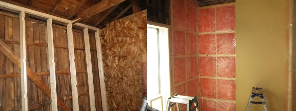 壁が室内側に傾いていました。新たに下地を入れて垂直な内壁を造りました。壁断熱と防湿処理後に石膏ボードを貼りました。