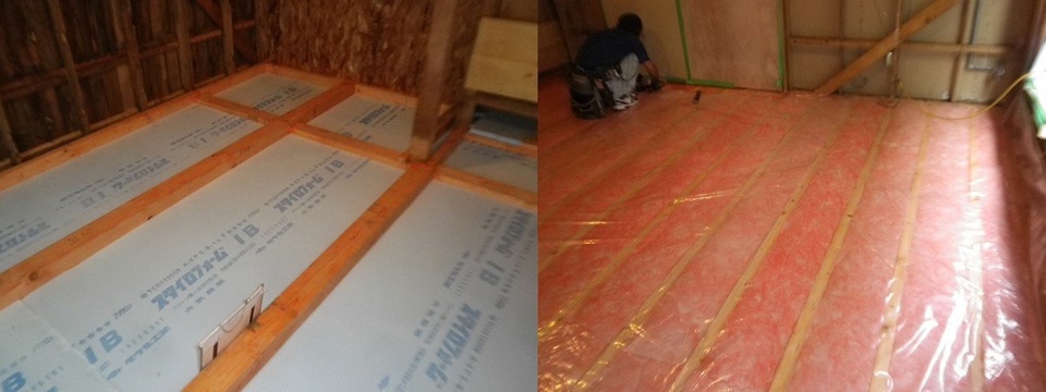 床下に断熱材(スタイロフォーム)30mmを敷き、さらにグラスウール200mmを敷き、床の断熱を強化しました。