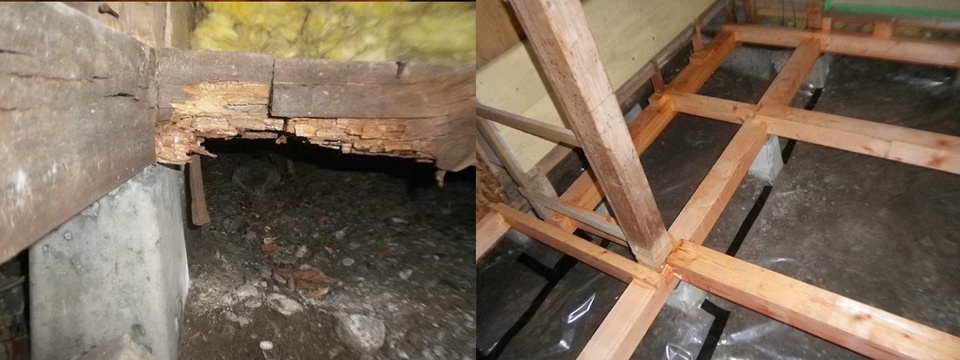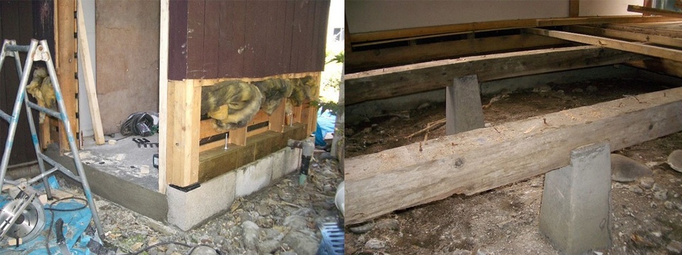 溝江一夫社長 外壁改修の前に床下もチェックしたところ、経年劣化や床下の湿気などにより、床を支える土台や大引きの腐食が進んでいました。