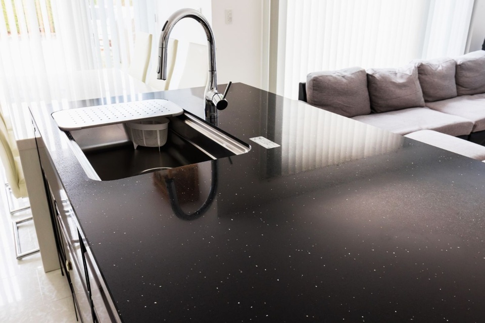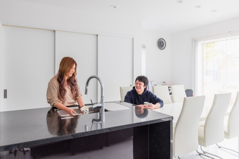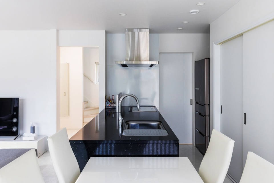 「すっと背筋の伸びるような、ホテルに来たような気持ちになれる家にしたかった」と奥様。最もこだわったというキッチンは、水晶をちりばめたタカラの黒いクォーツストーンのワークトップです。白い大理石調の床によく映え、全く生活感を感じさせません。