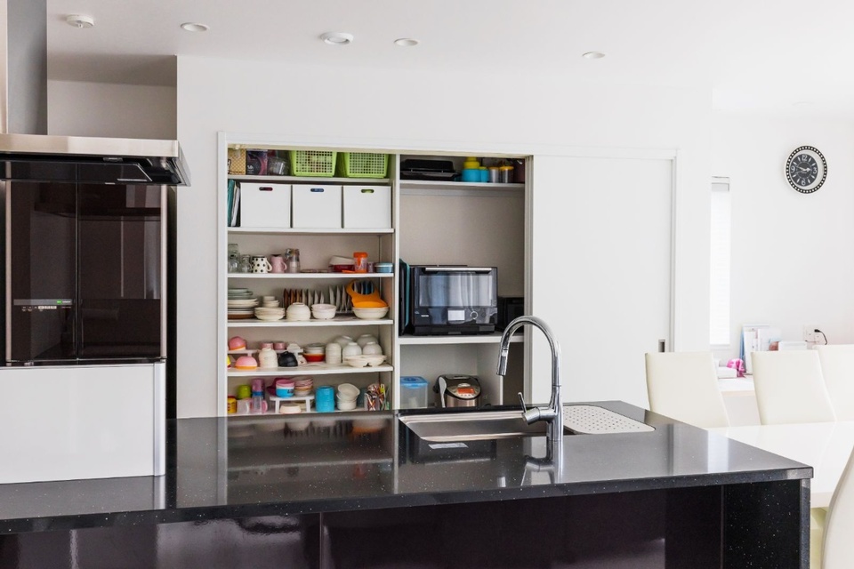 窓からの光にきらきらと輝くワークトップ。美しいだけでなく、汚れや傷もつきにくくお手入れが簡単なのも特徴です。家事が楽しくできるよう、タッチレス水栓やパンを焼けるコンロも装備、機能面でも申し分ありません。さて、まるでショールームのようなこのすっきりとした空間を保つために一役買っているのが…