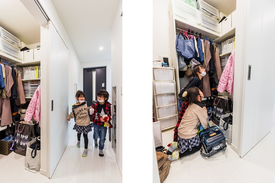 例えば学校から帰宅したお子さんが荷物を置くのは玄関近くの収納。ここに上着からランドセルまで、持ち帰った全てを片付けてしまいます。ランドセルから宿題を出したお子さんはすぐ隣の扉からダイニングへ。奥様が見守る中で宿題をするという流れがとてもスムーズです。